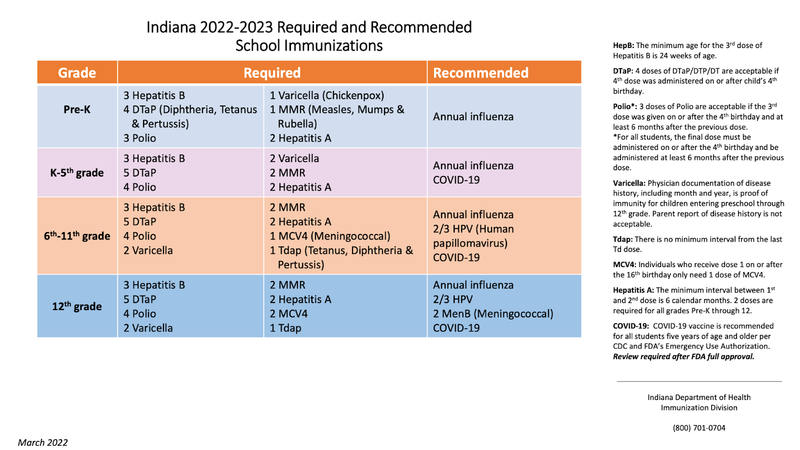 MSD Warren Township, in partnership with the Indiana Immunization Coalition, will be providing a clinic to accommodate immunizations required for school-age children and the COVID vaccine for individuals 5 years and older on Wednesday, September 7th at Moorhead Community Resource Center from 4:00 - 7:00 PM Families are encouraged to pre-register for this event. The registration link for the immunization clinic is patients.vaxcare.com/registration. After clicking on the link, enter the enrollment code, IN65942, and then select Warren Schools-9/7. Linked here and below are the required immunizations for school-age children for the 22-23 school year.